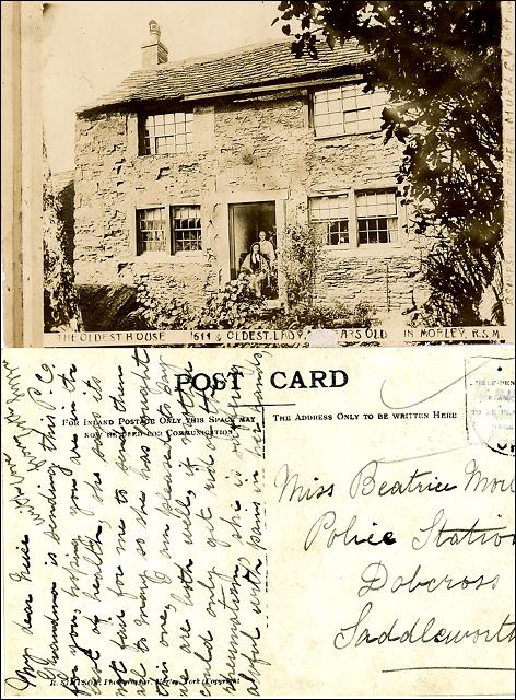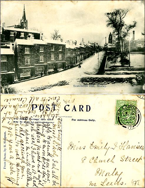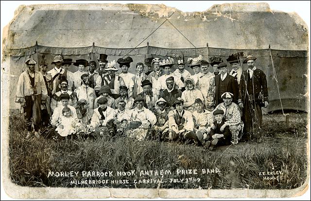 1900 – 1909 Railway Plate Layers in Drighlington Annie Watson walking in Pretty Lane Field House on King Street, Drighlington Old Cottages in King Street, Drighlington Row of cottages in Moorside Road, Drighlington A group of young men at Drighlington Zion Church Ebenezer fancy dress party Group of People outside a cottage Zion Sunday School, Morley Small coal(?) pit at Nethertown Page of a book Tom Sydney kept so he could win bets with his mother Sophia King Street and Drighlington Liberal Club View of Moortop, Drighlington Bock of houses next to the ‘Barracuda’ in Station Road, Drighlington Malt Shovel Inn, Whitehall Road, Drighlington Drighlington Zion Young Ladies Class Bill from G. S. Tetley, Tobacco Merchant Golden Wedding Party in the Gomersall family Group photograph of Fielding Family Thomas Header Lewis Mortimer with winners trophy and his bicycle Peter Underwood, aged 6 and 66 Medal given to Morley schoolchildren to mark the coronation of King Edward VII and Queen Alexandra Class Photo of young boys and their teachers at the Wesleyan School Drighlington terminus car 124 fitted with covered top End of Drake Lane, 181 Moorside Road,Drighlington Annie Peel nee Sykes Mother of Annie Peel (Grandma Sykes) Norrison Peel Three people in fancy dress Hannah Holroyd Furness, nee Glassell Studio photograph of Sarah and Manoah Bentley Thomas King Brumfitt, a local mill owner with a keen interest in Cricket Formal Portrait of Elizabeth Wainwright, nee Bastow born 1884 John Barstow with a grandchild Henry Fazackerley Ingle, son of William Law Ingle Portrait of Alice Elizabeth Fielding nee Wilson Lady Chapel, St. Paul’s Church, Drighlington Part of the stained glass window depicting “Industria”, given by Charles Scarth The Morley Coat-of-arms in the Town Hall stained glass window The Drighlington School Board 1904 postcard listing ‘The oldest house in Morley’ View of St Mary’s Church, Commercial Street Morley Churwell Park just after it was opened Looking towards the entrance of the Rehoboth Chapel, Dawson Hill, Morley Side view of Wellfield House, Churwell View of the house and garden of Wellfield House King Street, Drighlington, looking towards the Crossroads Photograph of 42, Morley Hole home of Manoah Bentley Morley Amateur Operatic Society’s show ‘Columbus’ at Morley Town Hall Group photo of Morley Parrock Nook Anthem prize band at the Milnsbridge Nursing Carnival Boys and Masters of St Peter’s School Railway bridge over Bruntcliffe Lane Looking up Scatcherd Hill from Morley Hall The Lodge on Victoria Road near St Peter’s Church A letter to Miss Emily Asquith from the Town Clerk offering her the Head Teacher position at Peel Street Girls School Engine House, Parkfield Mill, Fountain Street, Morley Plant at Parkfield Mill, Fountain Street, Morley The Old Morley Post Office, Queen Street Henry Ainley in his acting outfit John Barstow – Crimean Veteran Samuel Sykes, fireman and stone mason. Related Images: