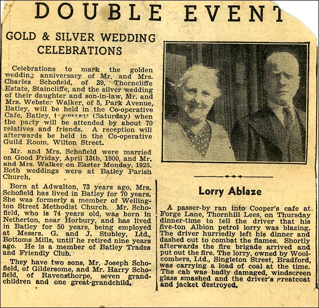1950 – 1959 Cross Hall School Football team and their trophies The old Nazarene Pentecostal Church, Albion St., Morley Man thatching straw stacks at Pinfold, Tingley Footpath to Morley Low Station at the side of the Miners Arms, Albert Road View of Morley Low Station and Daisy Hill Laura Askins, a plain loom weaver B2 Solar Boiler of Midland Bank, Morley Workers at Thomas Holdsworths Wire Works Two workers at Thomas Holdsworth wire works Emma Varley is presented to the Queen in Morley Iron Bridge at Drighlington Railway Station Moorland Mills, Drighlington Drighlington Moor showing Moorland Mill Drighlington Station signal box Drighlington Station King Street looking towards the Crossroads View of Drighlington with King Street in foreground Morley Low Railway Station, Morley Tunnel and the surrounds St. Bernard’s mill trip, Gildersome at the Belgravia Hotel Morley Young Farmers School children outside George Totham’s sweet shop, awaiting a Royal motorcade Concert Party at Drighlington Parish Church Coronation Bazaar at Ebenezer Methodist Church, Morley The front of Midland Bank, Queen St., Morley Midland Bank, King St., Drighlington Midland Bank, Town St., Gildersome, at Church Corner Manager’s office, Midland Bank, Queen St., Morley The Telephone at Midland Bank, Morley The back of Midland Bank, Queen St, Morley The Banking Hall at the Midland Bank Morley Golden and Silver Wedding celebrations in the Schofield family Workers of A M Marshall Mills, at a formal dinner Group of air raid wardens during World War 2 outside Tingley Mill Group outside the New Scarborough pub Tingley Walker family outside 11 Harrop Terrace, off Britannia Rd, Morley Lorry at H Cartlidge and Sons,Topcliffe Farm, Tingley Four wheel drive, ex Canadian Army lorry with V8 engine The Old White Bear public house Coach trip from The Old White Bear, Tingley with Heap’s Motor Tours Trip to head office of Cooperative society by members of the Morley Co-op Showing Lambeth Walk, Morley Group of women mill workers at Park Mills, Morley Tea break of workers in the canteen at Park Mills Park Mill workers on mill trip in Blackpool Hopewell Farm in winter time Invitation Card to Mr. and Mrs. N Peel to a Coronation Tea Group photo on the appointment of Harry Underwood as President of the local NUT A Drighlington Table Tennis Team Shield won by The Adwalton Zion Chapel, Youth Table Tennis Team Shield won by Adwalton, Zion Chapel, Table Tennis Team School photograph of Morley Grammar School Morley Grammar School First XI Hockey team Wedding family group Wedding group photo The motorcade of Queen Elizabeth II and Prince Philip in King Street Drighlington Close up of Queen Elizabeth II’s car in King Street Jesse Stevenson’s grocer’s shop, King Street, Drighlington Two adults and two children at Hopewell Farm The Hornsby family Grayshon Street just off Moorside Road Workers from St. Bernard’s Mill, Gildersome on a festive occasion Portrait of H B Browne, with his signature Charles Albert Slingsby, aged 13 George Slingsby, shaftsman, with a refugee from the Hungarian Revolution at the top of Topcliffe Pit shaft The surroundings of the Hornsby House on Deansway, Asquith Avenue The Signal Box at Morley Top Station View inside the Signal Box, Morley Top Station Express train to Tingley, passing through Morley Top Station Group of Bridesmaids to Jean Lewis Mortimer View of the Albert Mills and Police Inspector’s house Related Images: